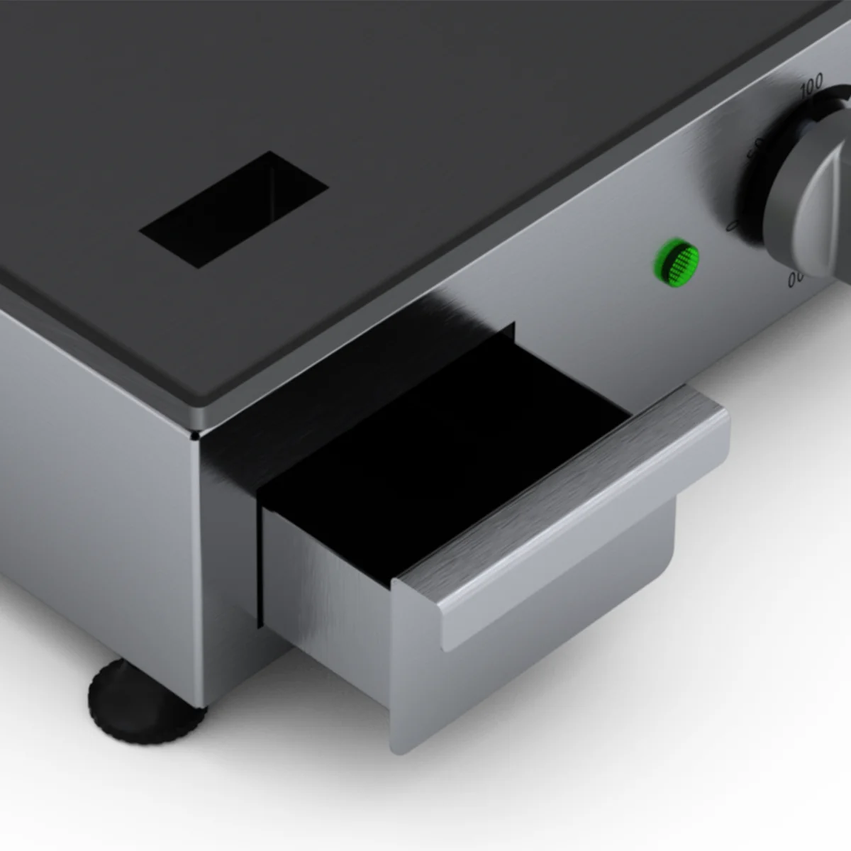 Il barbecue è dotato di una vaschetta rimovibile per il grasso in eccesso, che durante la cottura raccoglie il grasso e i succhi in eccesso. La vaschetta può essere rimossa facilmente, svuotata e lavata, anche in lavastoviglie. Il svuotamento e la pulizia regolari della vaschetta prevengono l’accumulo di grasso e garantiscono un uso sicuro e igienico del barbecue.