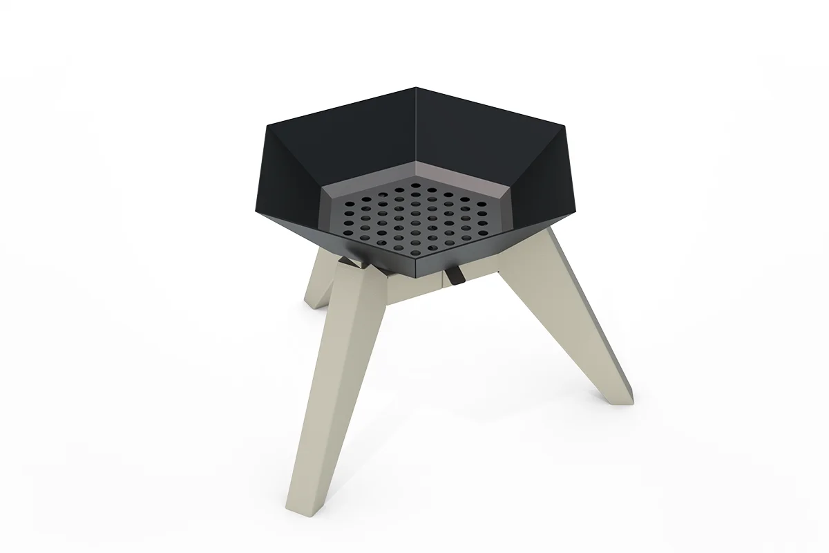Il braciere da giardino alto è di forma esagonale e poggia su tre gambe solide e alte, che garantiscono stabilità e altezza ottimale per un uso sicuro.